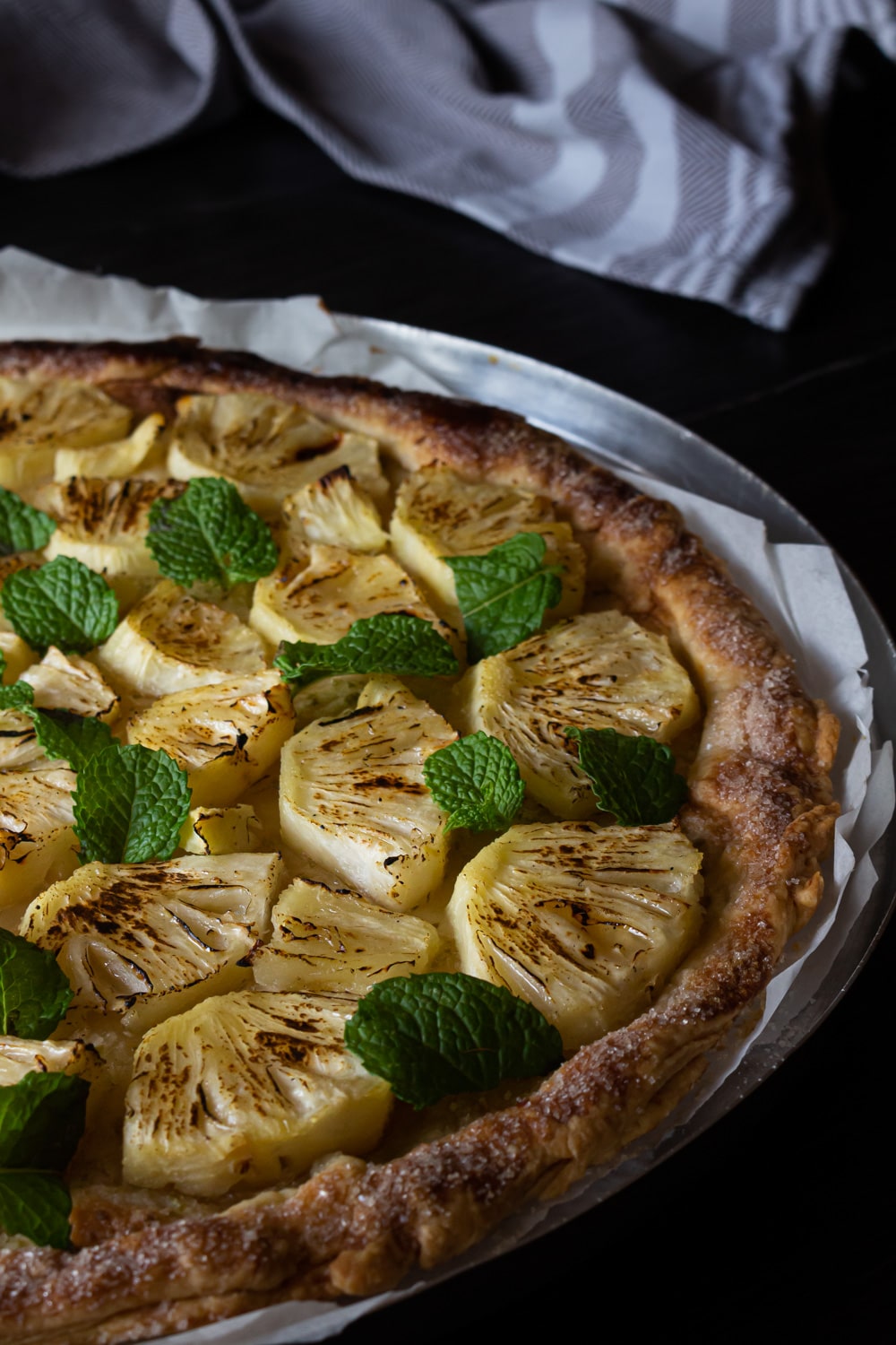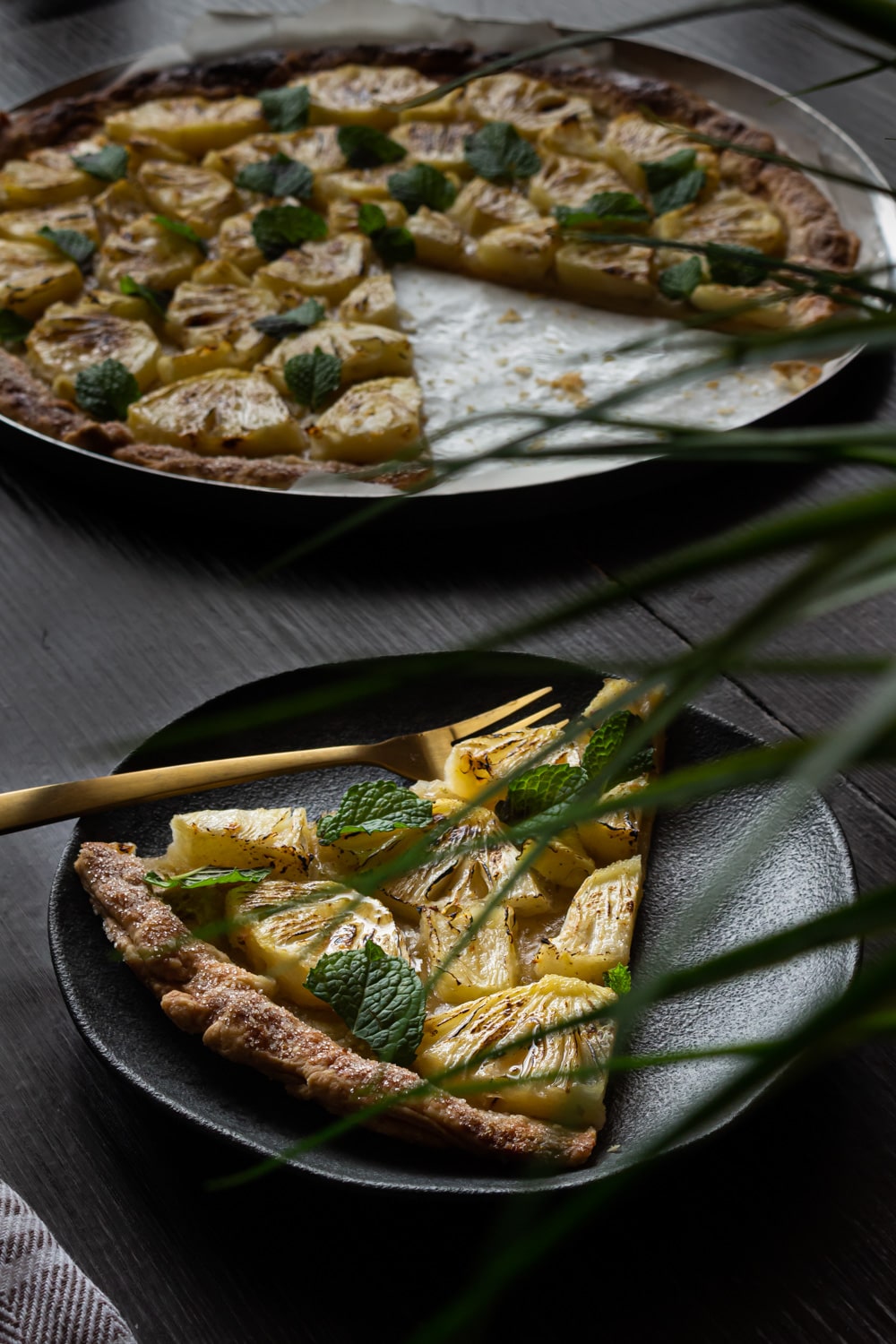 Galette de abacaxi com hortelã pra juntar uma massa fininha e crocante, com um recheio suculento e muitos perfumes!