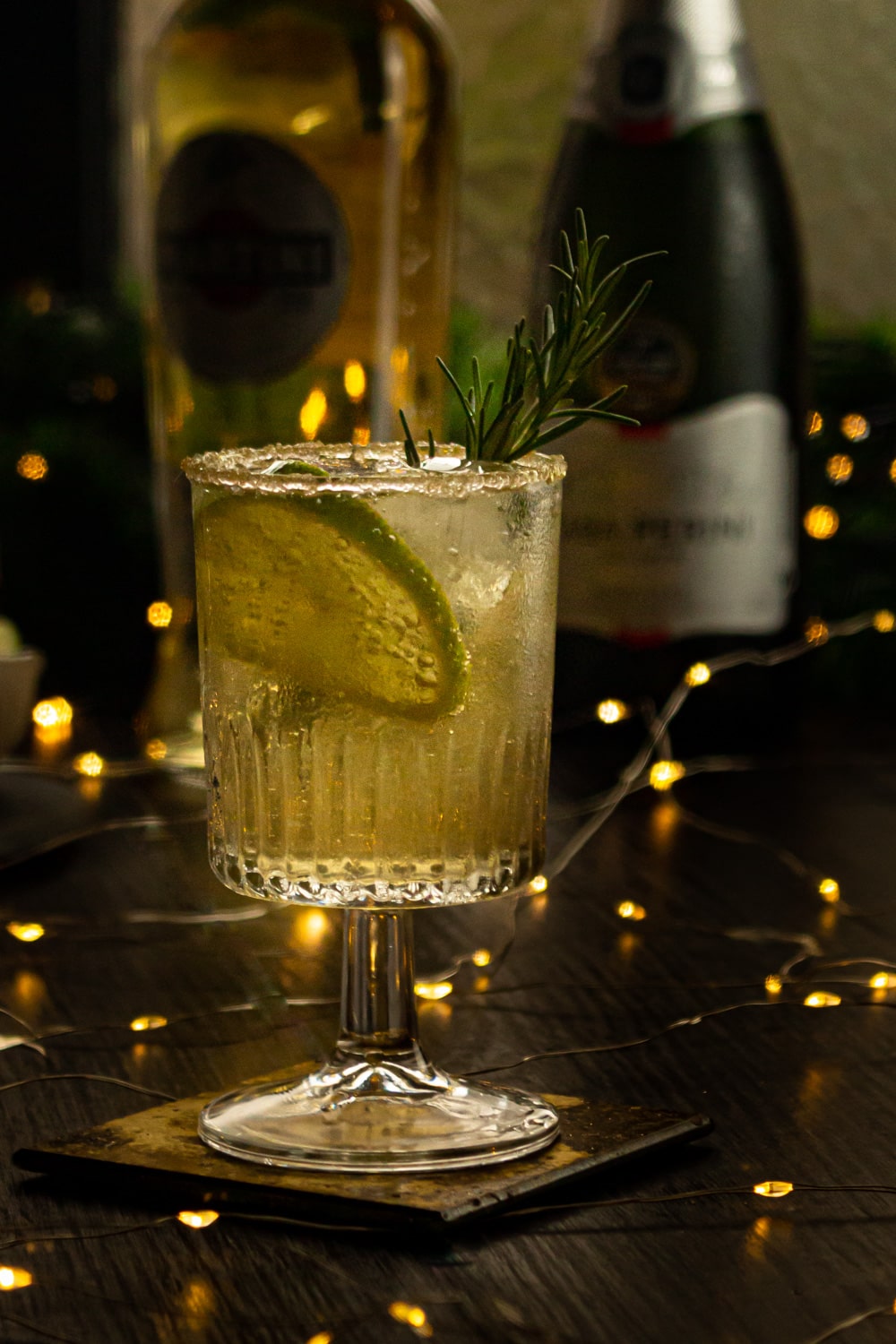 - Direto na taça em que for servir combine algumas pedras de gelo, duas fatias de limão e um ramo de alecrim.