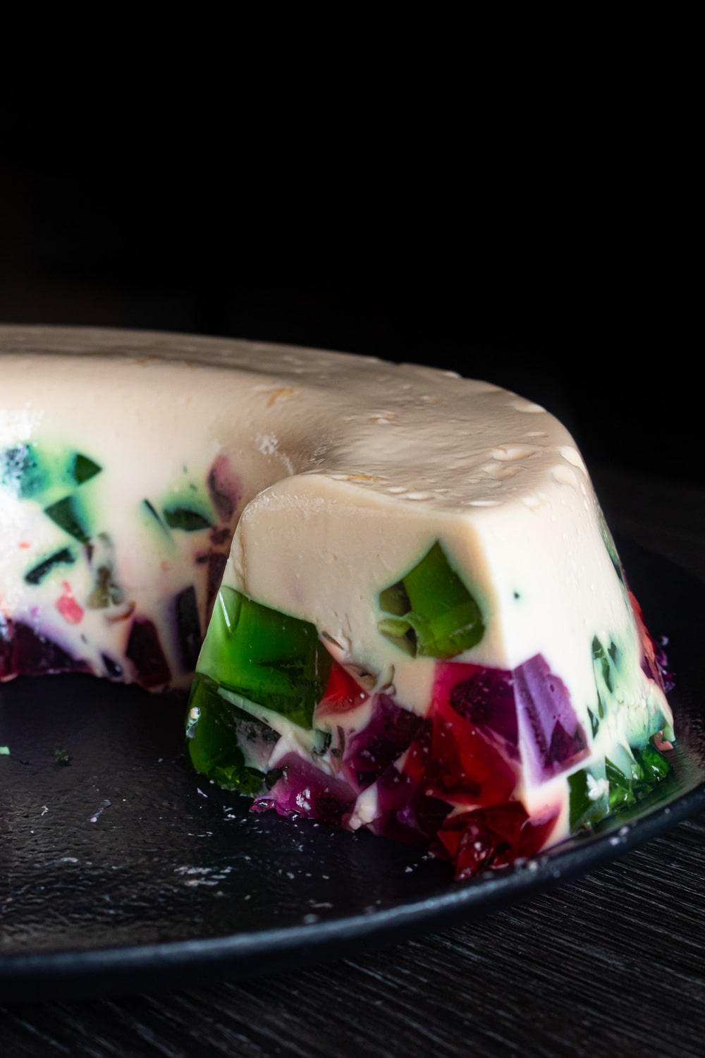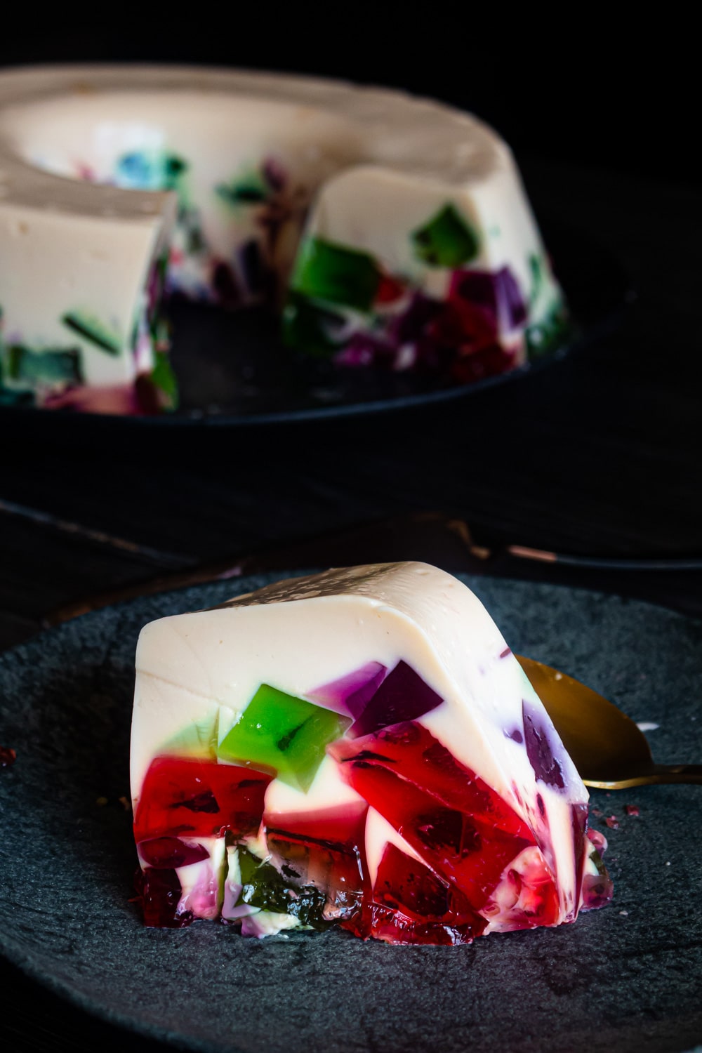 Uma última dica: se a sua forma tiver um degrau, fica mais fácil soltar essa parte de cima com uma faca sem serra e só então soltar a gelatina com as pontas dos dedos. Eu gosto de usar os dedos porque não fica aquela marca de faca na lateral do mosaico de gelatina. Esse é um truque que aprendi com a Sandra do Receitas do Caldeirão. 💜