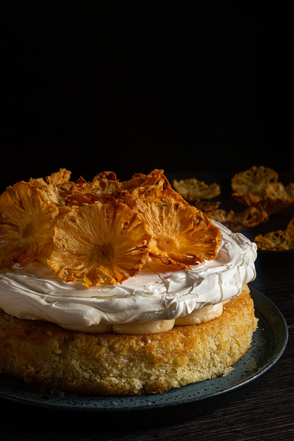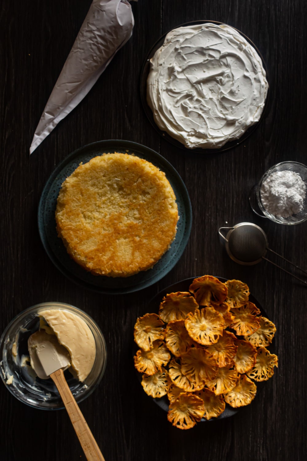 - Por cima do creme coloque o disco de suspiro. E por cima do suspiro, bem no centro dele, faça um montinho com o restante do creme. Cubra esse montinho com as flores de abacaxi, ajeite como achar melhor. E use mais flores para enfeitar o prato ou a lateral do bolo, se quiser.Com uma peneira polvilhe açúcar de confeiteiro sobre tudo.